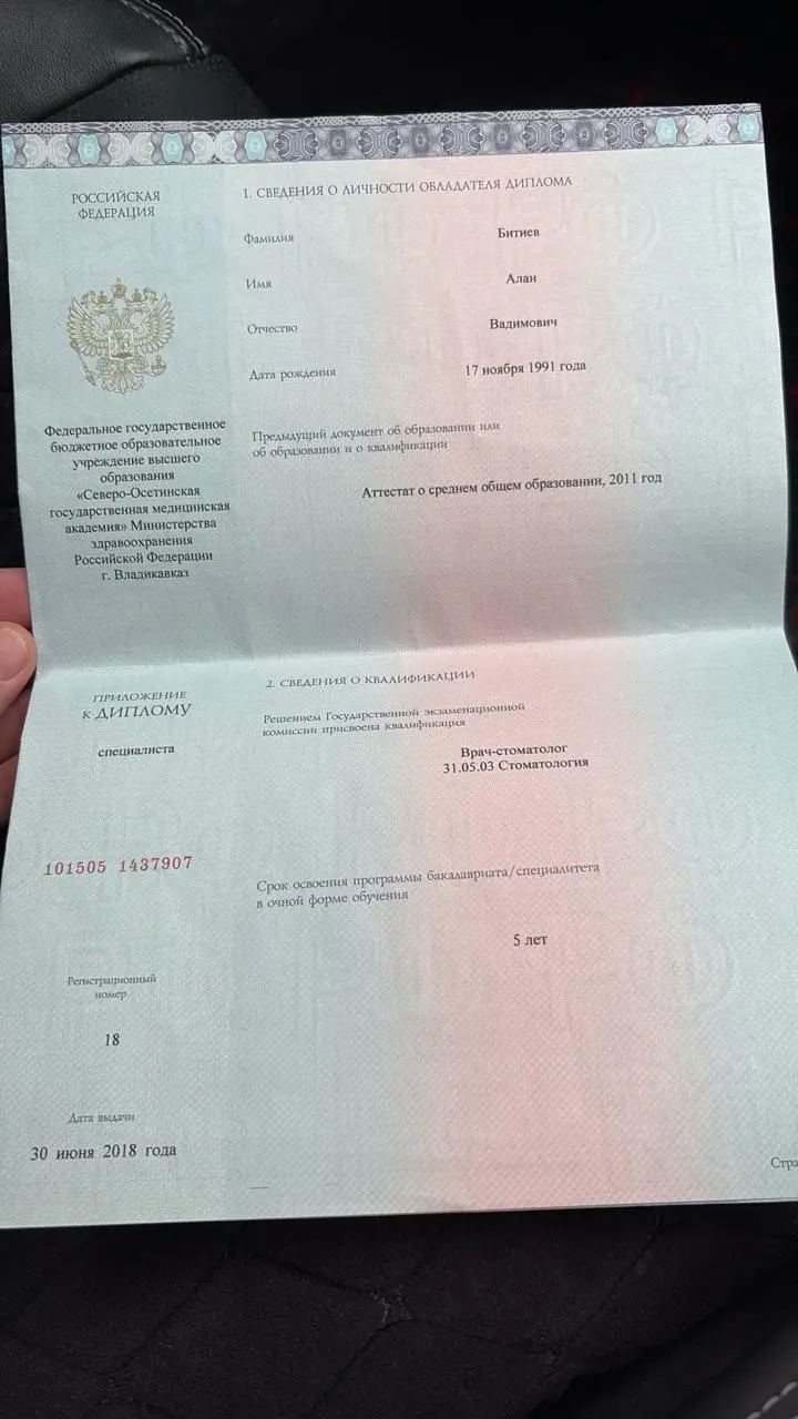 - 2018 г. — Северо-Осетинская государственная медицинская академия, специальность «Стоматология»