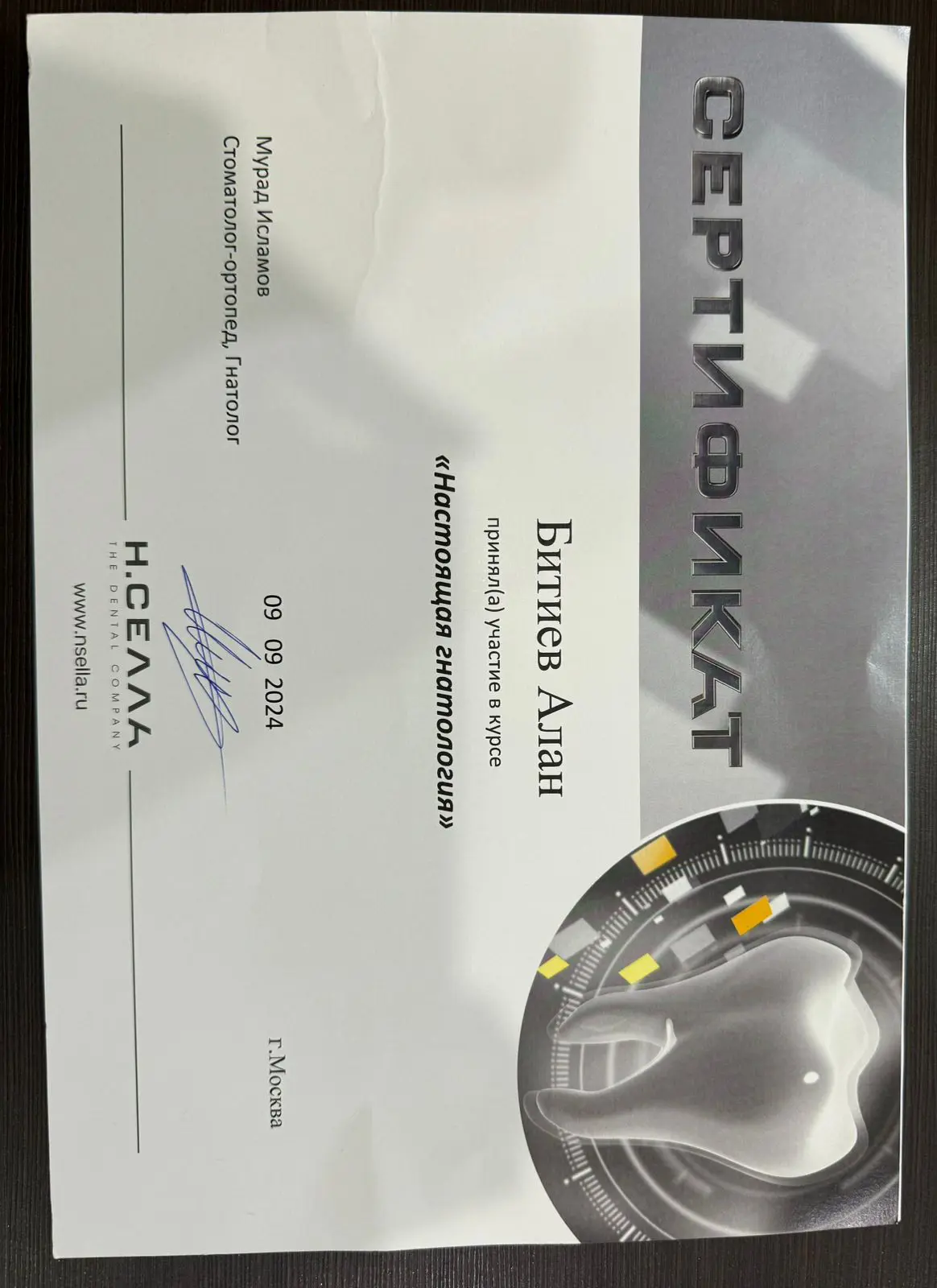 - 2020 г. — Северо-Осетинская государственная медицинская академия, клиническая ординатура по специальности «Ортопедическая стоматология»
