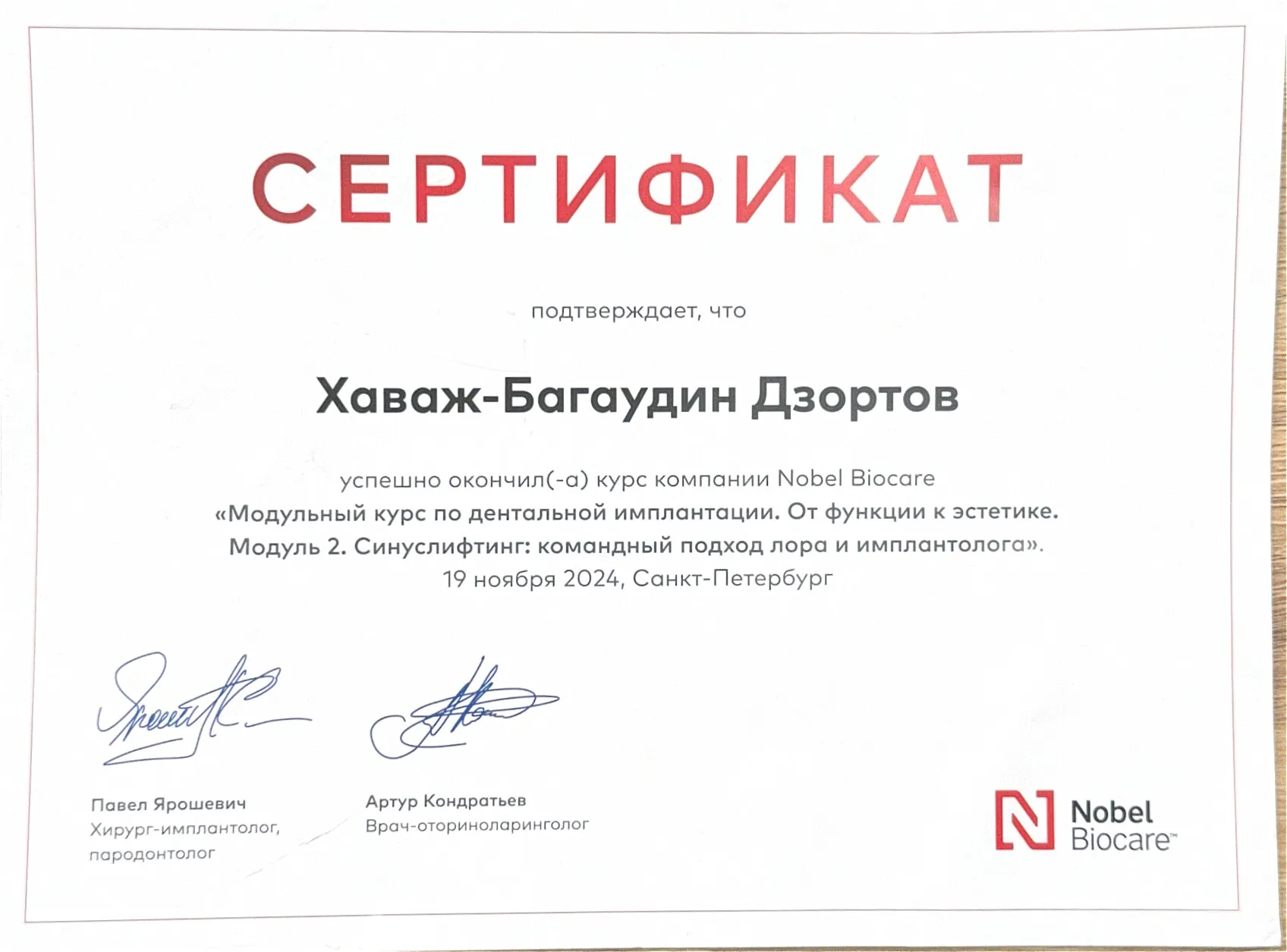 2024 «Модульный курс по дентальной имплантации. От функции эстетики. Синус-лифтинг: командный подход лора и имплантолога». Nobel Biocare Автор курса: Павел Ярошевич