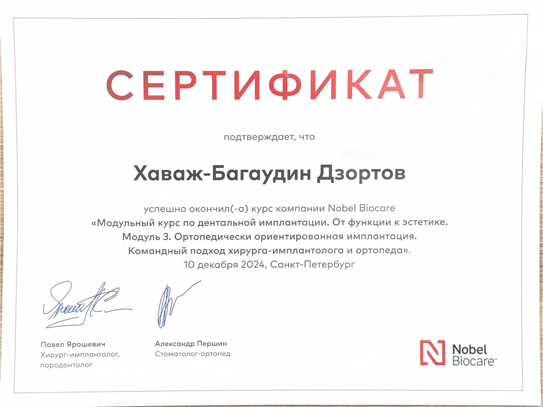 2024 «Модульный курс по дентальной имплантации. Эстетическая имплантация». Nobel Biocare Автор курса: Павел Ярошевич