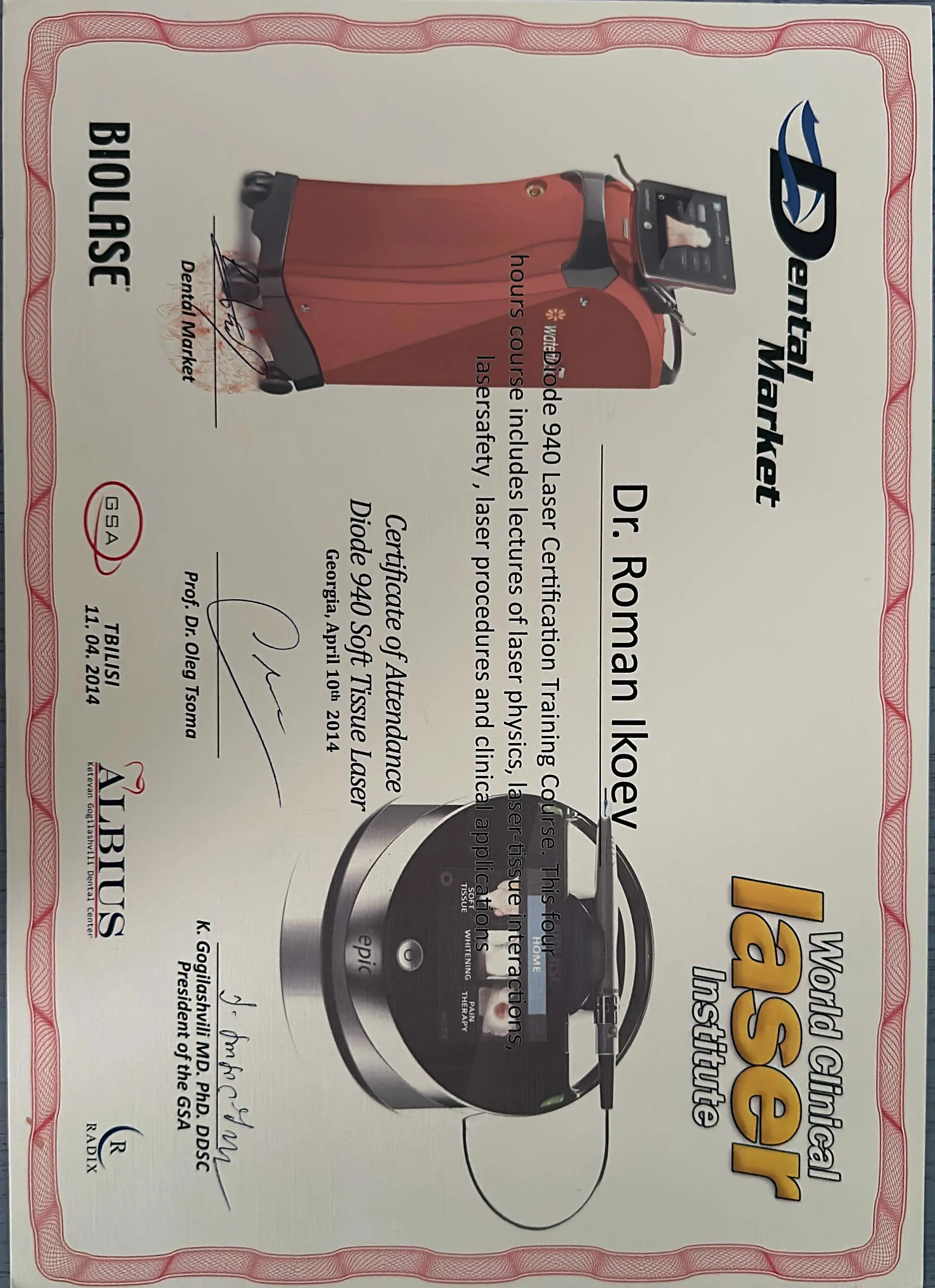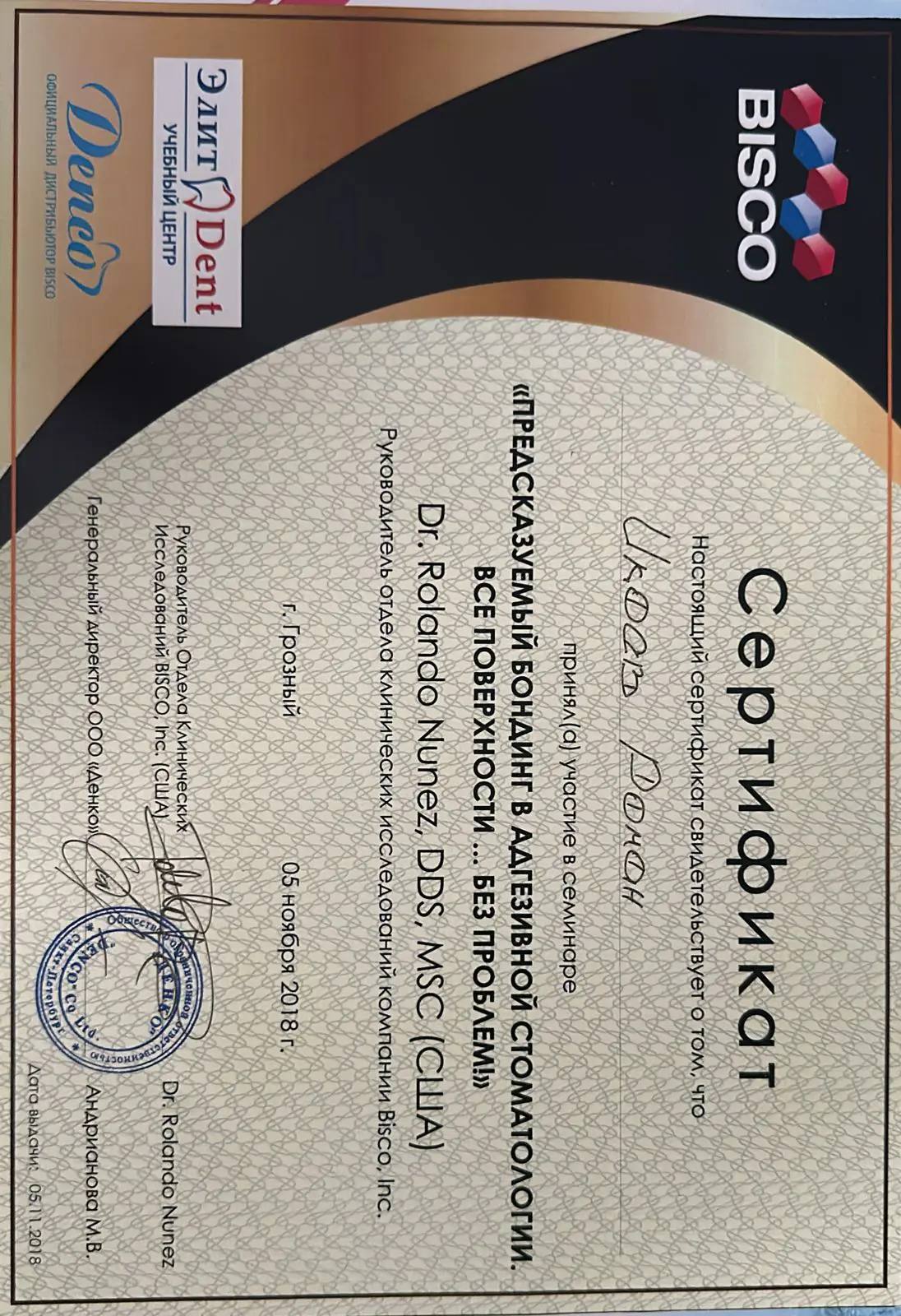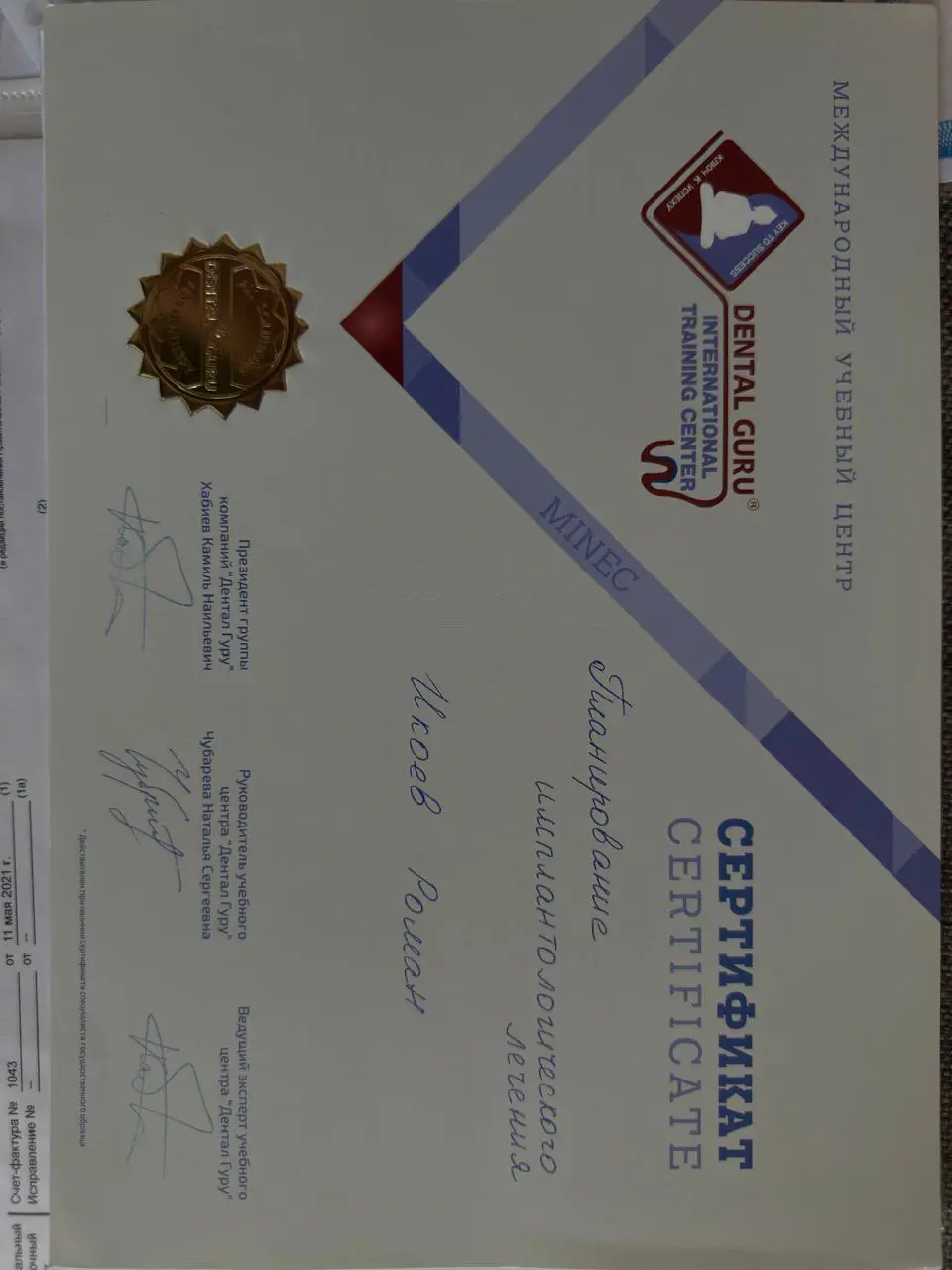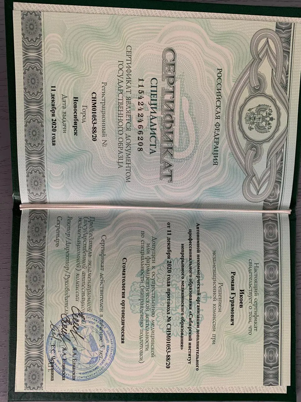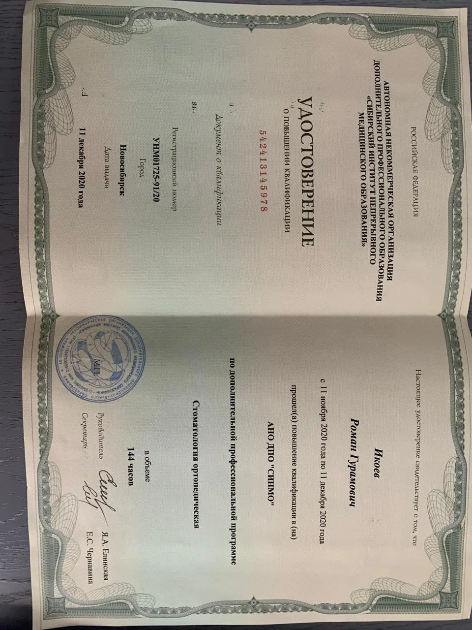 - 2020 г. — Сибирский институт непрерывного медицинского образования, «Стоматология ортопедическая»