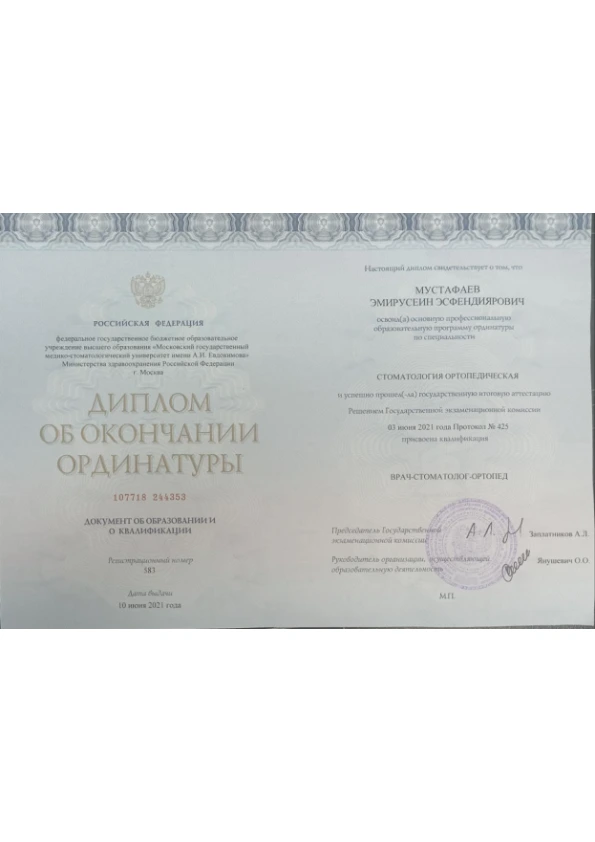 - 2019–2021 гг. — МГМСУ им Е. И. Евдокимова по специальности «стоматология ортопедическая»