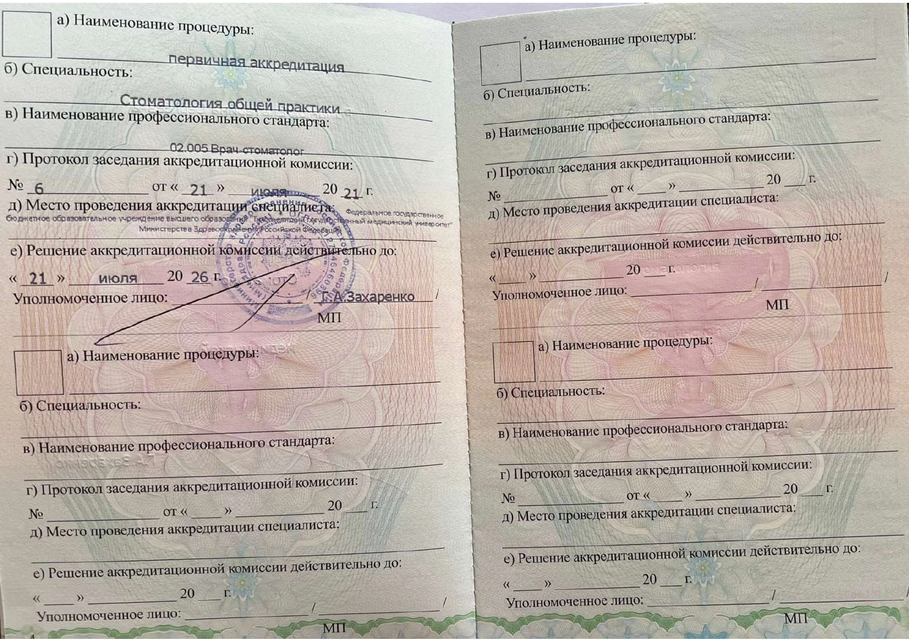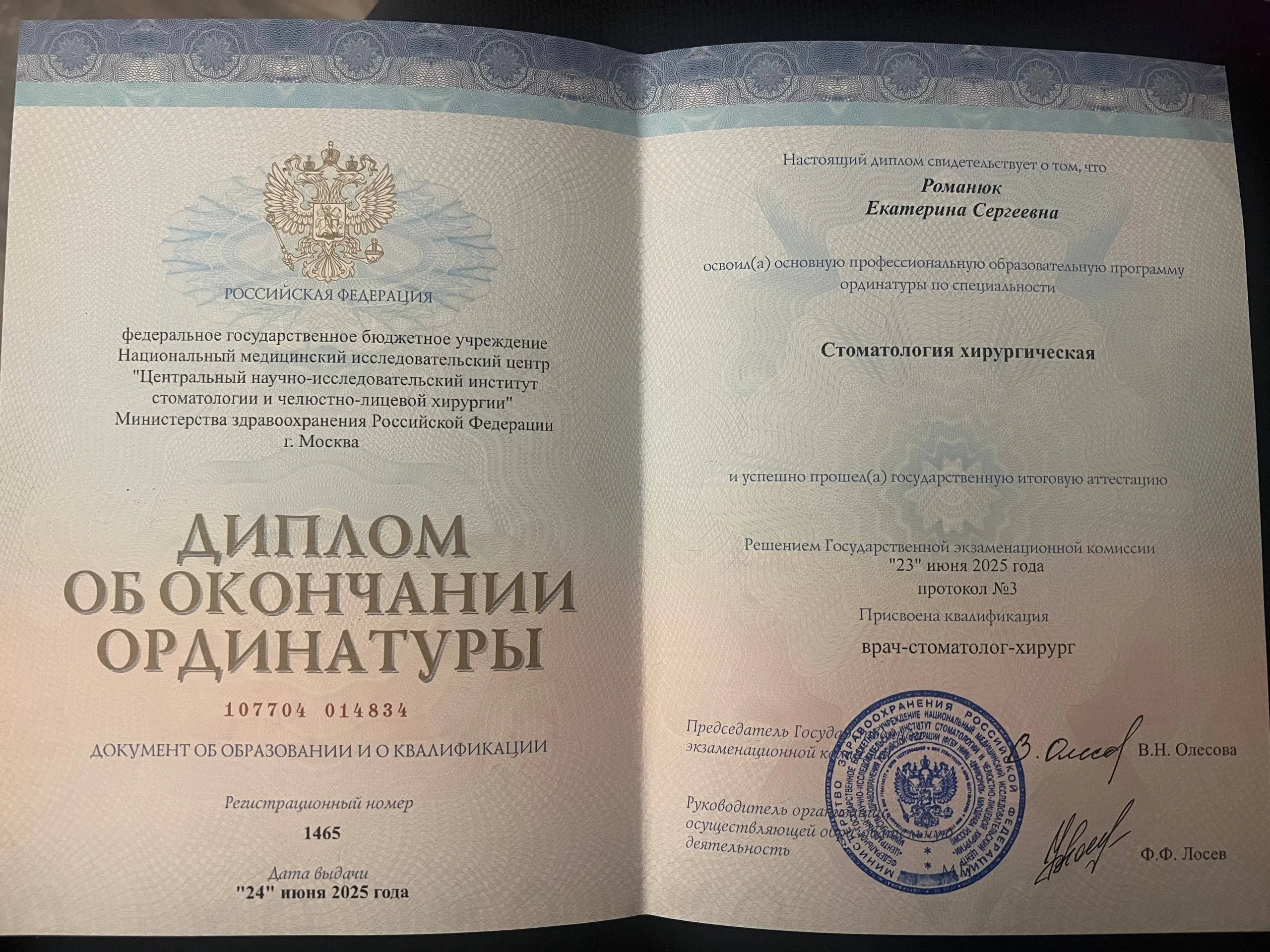 - Ординатура: Центральный научно-исследовательский институт стоматологии и челюстно-лицевой хирургии (ЦНИИСиЧЛХ). Врач-стоматолог-хирург (2025 год).