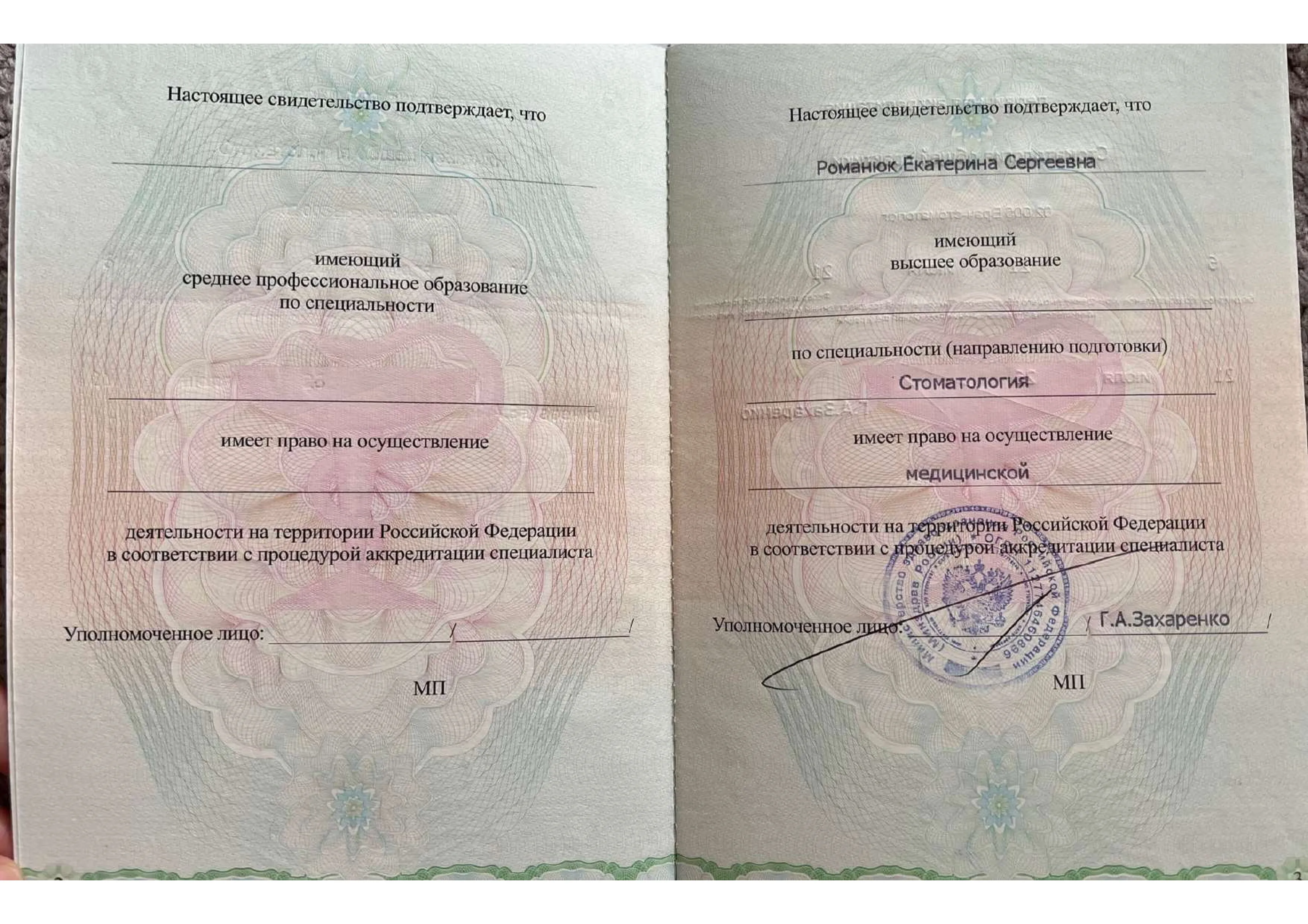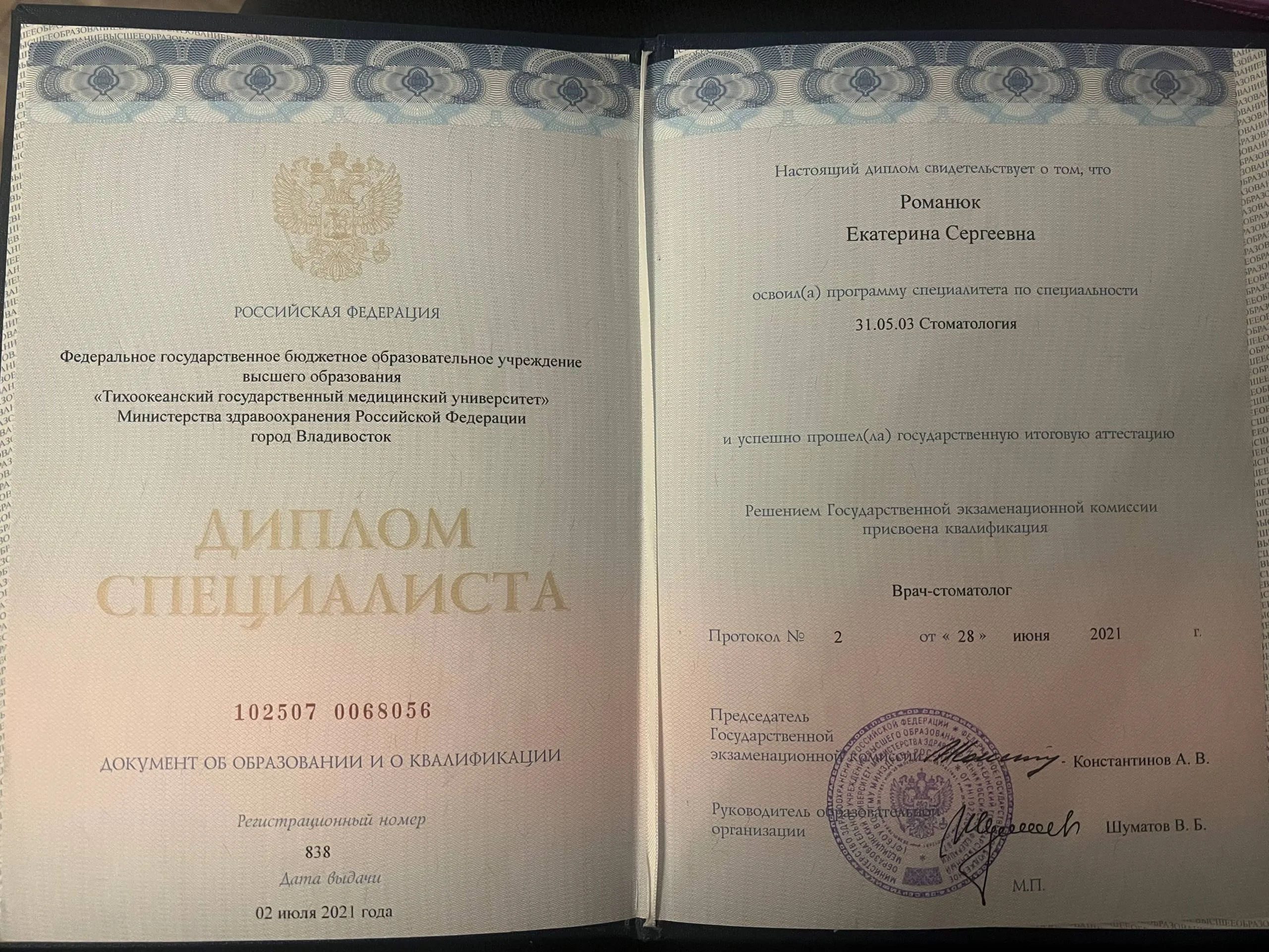 - Специалитет: Тихоокеанский Государственный Медицинский Университет (ТГМУ). Врач-стоматолог (2021 год)
