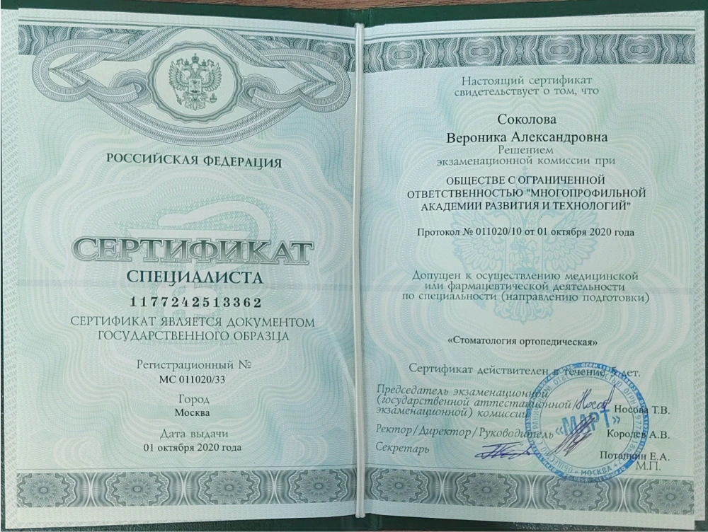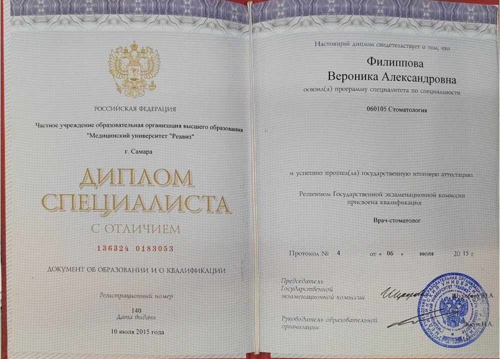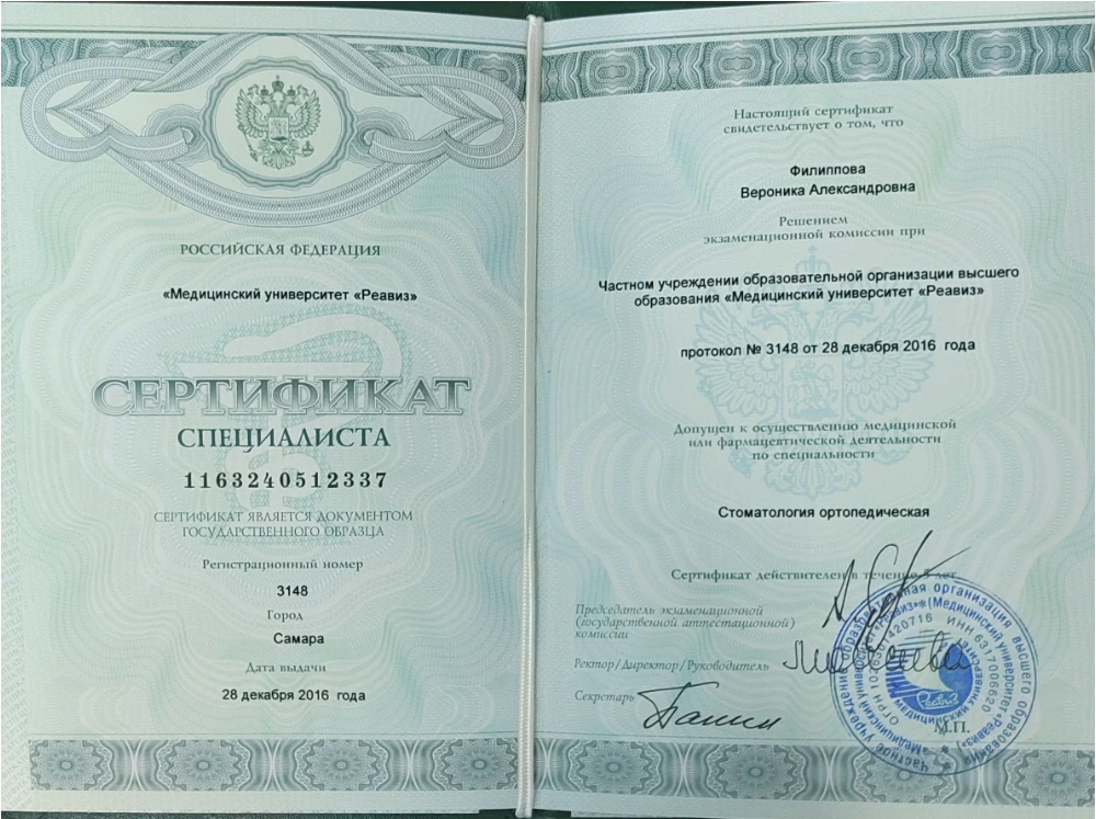 2016 — Самарский университет «Реавиз» профессиональная переподготовка «Стоматология ортопедическая»
